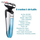 ماشین اصلاح کیمی مدل KM-5390 ازجمله دستگاههای حرفهای کیمی است که به دلیل قابلیت چهار کاره بودن از محبوبیت بالایی بین مصرف کنندگان برخوردار است که سری اصلی آن از جنس استیل ضد زنگ است و دارای تکنولوژی اصلاح برش چرخشی با انعطاف بالا می باشد که ضخیمترین و ریزترین موها را به دام می اندازد و در صورتی که موها بلندتر باشد میتوان از طریق سری مخصوص که بر روی دستگاه سوار میشود برای کوتاه کردن استفاده کرد. با سری خط زن این دستگاه که یک سری کامل است میتوان برای اصلاح خط ریش و سبیل استفاده کرد. سری دیگر این دستگاه برای اصلاح مو های گوش و بینی است و دیگر سری این دستگاه که در کمتر دستگاهی است و بسیار برای پوست مناسب است سری پاکسازی است که کاملا پوست را تمیز کرده و بعد از اصلاح به پوست شادابی می بخشد. از دیگر نقاط مثبت دستگاه مجهز بودن به باتری لیتیوم یون قابل شارژمیباشد که با دو ساعت استفاده 120دقیقه قابل استفاده است خوشبختانه این محصول از سیستم شارژ سریع بهره میبرد که با 10دقیقه شارژامکان یک بار اصلاح برای شما فراهم میشود. این دستگاه دارای عملکرد قفل مسافرتی است که دکمه پاور را 3 دقیقه فشار دهید وارد حالت قفل مسافرتی شده که مانع از روشن شدن دستگاه به طور تصادفی می شود. از آنجایی که دستگاه کاملا ضد آب می باشد میتوان زیر دوش و به صورت خشک و مرطوب استفاده کرد .همچنین دستگاه دارای صفحه نمایش میباشد که در حین کار از میزان شارژ باقیمانده مطلع خواهیم شد..نا گفته نماند این محصول علاوه بر طراحی شیک و ساده دارای وزنی ایده آل است لذا مانع خستگی دستها می شود.