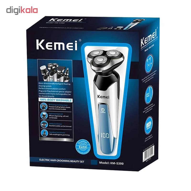 ماشین اصلاح کیمی مدل KM-5390 ازجمله دستگاههای حرفهای کیمی است که به دلیل قابلیت چهار کاره بودن از محبوبیت بالایی بین مصرف کنندگان برخوردار است که سری اصلی آن از جنس استیل ضد زنگ است و دارای تکنولوژی اصلاح برش چرخشی با انعطاف بالا می باشد که ضخیمترین و ریزترین موها را به دام می اندازد و در صورتی که موها بلندتر باشد میتوان از طریق سری مخصوص که بر روی دستگاه سوار میشود برای کوتاه کردن استفاده کرد. با سری خط زن این دستگاه که یک سری کامل است میتوان برای اصلاح خط ریش و سبیل استفاده کرد. سری دیگر این دستگاه برای اصلاح مو های گوش و بینی است و دیگر سری این دستگاه که در کمتر دستگاهی است و بسیار برای پوست مناسب است سری پاکسازی است که کاملا پوست را تمیز کرده و بعد از اصلاح به پوست شادابی می بخشد. از دیگر نقاط مثبت دستگاه مجهز بودن به باتری لیتیوم یون قابل شارژمیباشد که با دو ساعت استفاده 120دقیقه قابل استفاده است خوشبختانه این محصول از سیستم شارژ سریع بهره میبرد که با 10دقیقه شارژامکان یک بار اصلاح برای شما فراهم میشود. این دستگاه دارای عملکرد قفل مسافرتی است که دکمه پاور را 3 دقیقه فشار دهید وارد حالت قفل مسافرتی شده که مانع از روشن شدن دستگاه به طور تصادفی می شود. از آنجایی که دستگاه کاملا ضد آب می باشد میتوان زیر دوش و به صورت خشک و مرطوب استفاده کرد .همچنین دستگاه دارای صفحه نمایش میباشد که در حین کار از میزان شارژ باقیمانده مطلع خواهیم شد..نا گفته نماند این محصول علاوه بر طراحی شیک و ساده دارای وزنی ایده آل است لذا مانع خستگی دستها می شود.