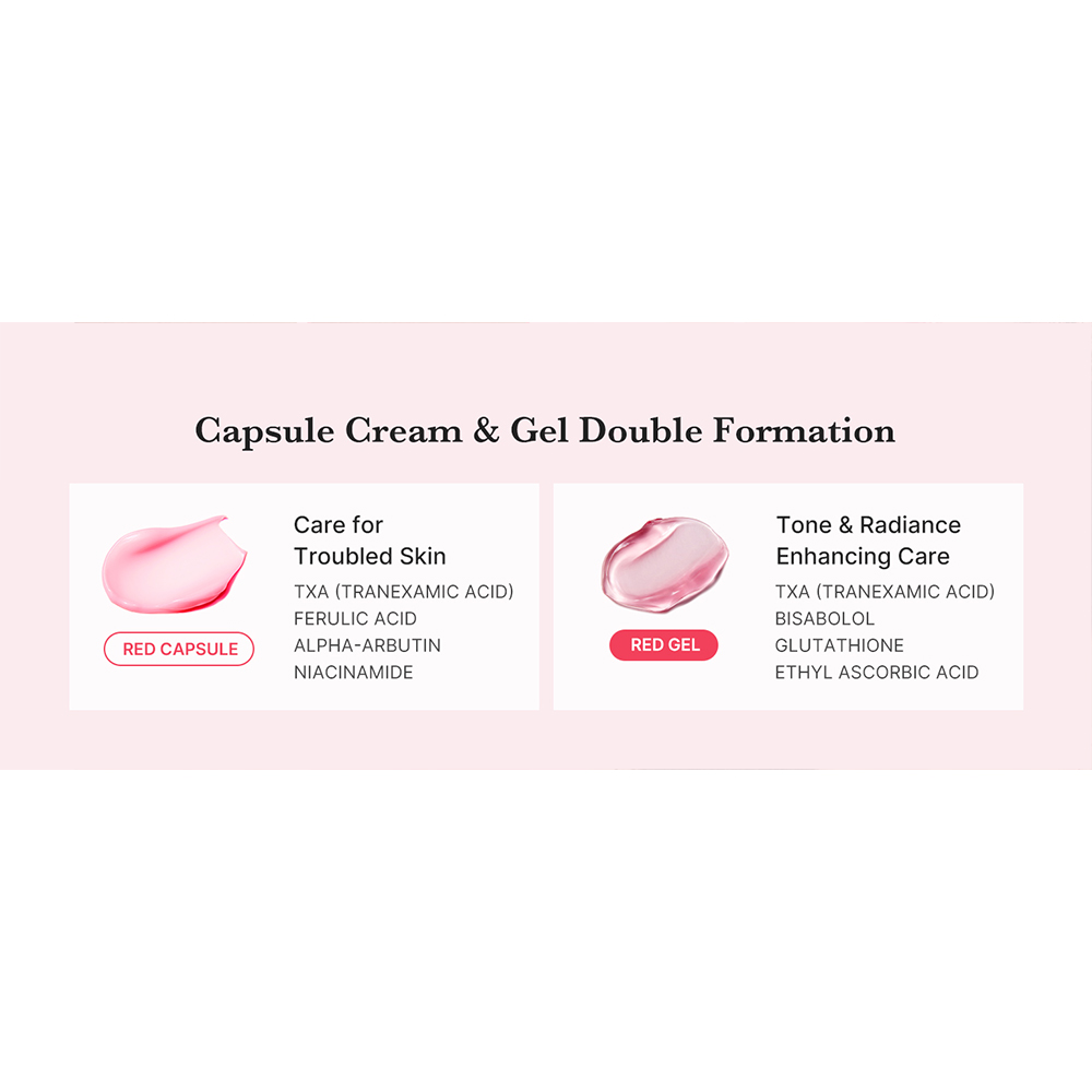 - حاوی کپسول هایی با ترکیب آلفا آربوتین، ترانگزامیک اسید و نیاسینامید جهت ایجاد پوستی روشن، یکدست و شفاف