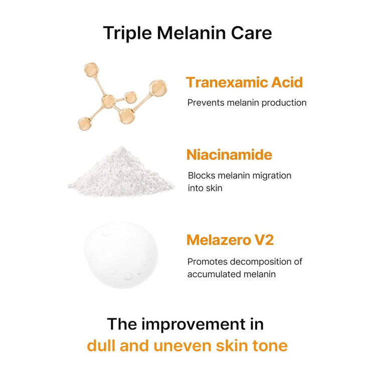 - فرمولاسیون سبک و غیرچسبنده با ترکیب نوآورانه Melazero V2 , نیاسینامید ,اسید ترانگزامیک و هیالورونیک اسید و دارای بافتی کرمی و زود جذب
