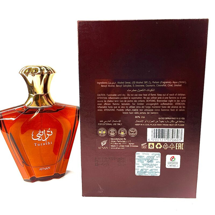 عطر ادکلن تراثی قهوه ای افنان مشابه ای با کیفیت از ادکلن تاکسیدو ایفسن لورن است . عطری با رایحه گرم ادویه ای و چوبی است . البته که وجود نت های وانیلی و کهربایی موجود در این ادکلن حس و حال متفاوتی را به نت های تند چوبی می دهد . به دلیل شباهت بسیار عالی این عطر به تاکسیدو گران قیمت خیلی از عطر بازها ترجیح می دهد محصول شرکت افنان را جایگزین بکنند . فروشگاه عطر ادکلن نجمل وارد کننده مستقیم و بدون واسطه ادکلن عطری است . تمامی محصولات شرکت افنان به صورت مستقیم از شرکت تولید کننده خریداری می شود .